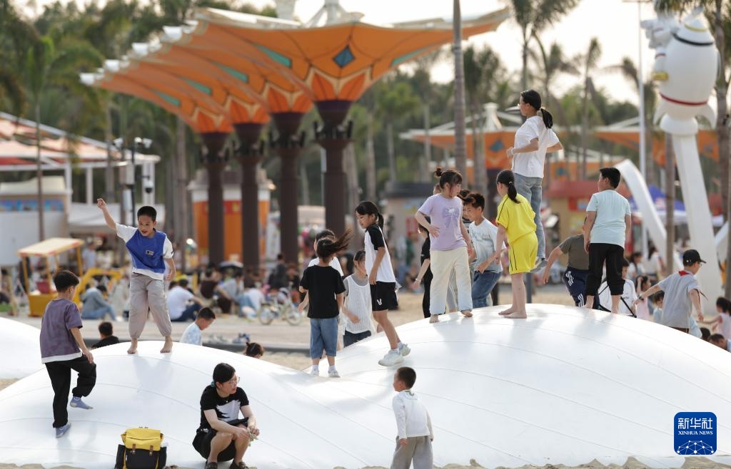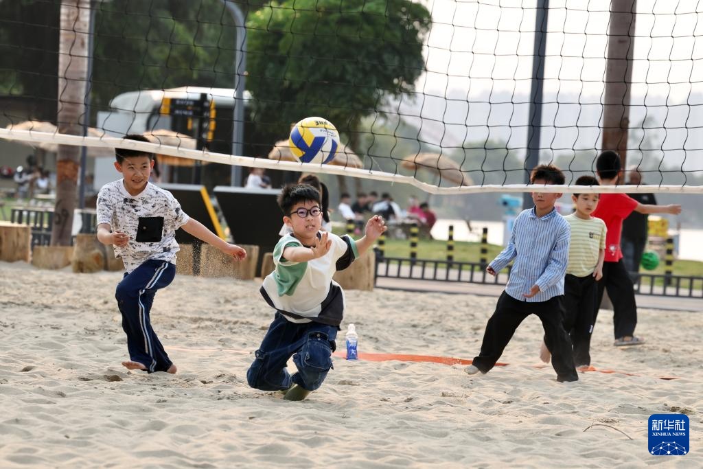 4月11日,小朋友在福建漳州龙江岁月景区玩沙滩排球。新华社记者 姜克红 摄